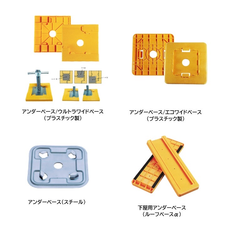 プラスチック製のアンダーベースは、真ん中にベース部分をはめ込むエコワイドタイプと設置する箇所に合わせてベースをはめる場所を変更できるウルトラワイドタイプがあり、屋根用の自在ジャッキベースの場合はベース部分を横方向で位置を調節でき、さらに屋根部分を傷つけない様にするゴムがついた下屋用アンダーベースなどがあります。