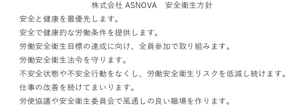 弊社では上記安全衛生方針を掲げております。社員全員が規定を守り安全且つ健康に安全衛生を改善していくことで、お客様にも最大限のパフォーマンスで安全と安心を提供できる様に努めてまいります。