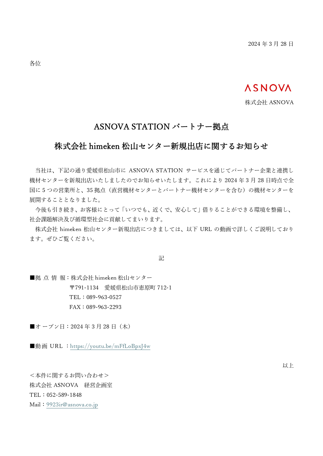 当社は、下記の通り愛媛県松山市に ASNOVA STATION サービスを通じてパートナー企業と連携し機材センターを新規出店いたしましたのでお知らせいたします。これにより 2024 年 3 月 28 日時点で全国に 5 つの営業所と、35 拠点(直営機材センターとパートナー機材センターを含む)の機材センターを展開することとなりました。
