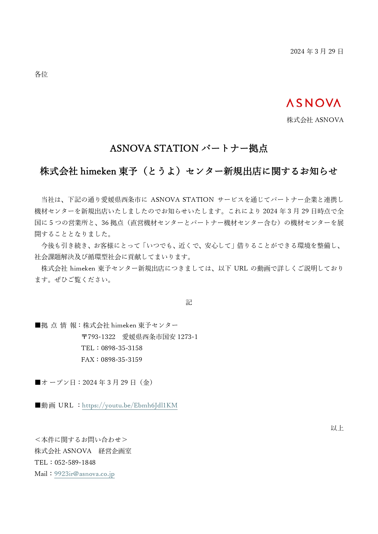当社は、下記の通り愛媛県西条市に ASNOVA STATION サービスを通じてパートナー企業と連携し機材センターを新規出店いたしましたのでお知らせいたします。これにより 2024 年 3 月 29 日時点で全国に 5 つの営業所と、36 拠点(直営機材センターとパートナー機材センター含む)の機材センターを展開することとなりました。